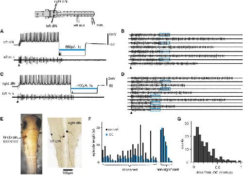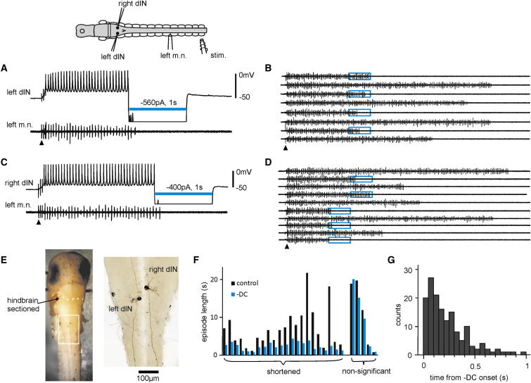 Figure 2. Swimming Stopped Abruptly when Large Hyperpolarizing Currents Are Injected into Single dINs(A) Injecting −560 pA into a dIN on the left side stopped swimming.(B) Repetitive trials of 1 s −DC injection (blue boxes) into the dIN shown in (A) alternated with controls.(C) Injecting −400 pA into a dIN on the right side also stopped swimming.(D) Repeated 1 s −DC injections (blue boxes), as shown in (C), were alternated with controls. dINs in (A) and (C) are recorded simultaneously, but only one recording trace is shown to simplify illustration.(E) Neurobiotin staining of the dINs recorded in (A) and (C). Left: dorsal view showing the location of dINs in the caudal hindbrain (dotted line marks location of cross-section). Right: the anatomy of the two dINs with their ipsilateral axons magnified from the boxed area in the left photo. Arrowhead points at the time of skin stimulation in (A)–(D). Recordings in (A) and (C) are off scale during −DC.(F) Average episode lengths are shortened by −DC injections in 22 out of 27 dINs (cf. controls).(G) Distribution of the time taken for a 1 s −DC to stop swimming in 152 successful trials. Top diagram is a dorsal view of the CNS with muscles and electrodes. Hindbrain was sectioned at the white line. m.n., motor nerve recording; Stim., stimulating electrode. |