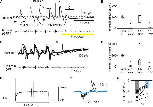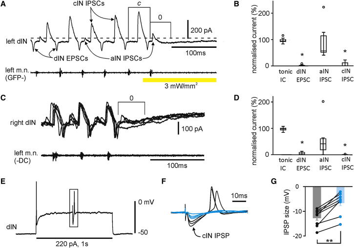 Figure 5. One-Sided Silencing Depressed cIN Inhibition and dIN Excitation and Necessity for cIN Inhibition in dIN Rebound Firing(A) The last cycles of a swimming episode, in which light (yellow bar) stopped swimming within one cycle. Different synaptic currents are labeled (c is used as a control cycle).(B) Normalized synaptic currents in dINs in cycle 0, as shown in (A), in light silencing trials (eight dINs, 53 trials). Tonic inward current (IC) was measured as the difference between the clamping current at rest (dashed line in A) and the current level just before each cIN IPSC.(C) Five superimposed trials with âDC injections, aligned to the last m.n. burst, showing synaptic currents in cycle 0.(D) Normalized synaptic currents in dINs in cycle 0 in âDC injection experiments (seven dINs, 51 trials). Synaptic currents are normalized to those in control cycles in (B) and (D). All recordings are from the ArCh-GFP negative side or the side without âDC injections into dINs.(E) dIN usually fires a single spike at the onset of a depolarizing pulse (220 pA, 1 s) but can also fire on rebound.(F) The boxed area is expanded to show rebound spikes following cIN IPSPs (seven trials overlayed). IPSPs failing to evoke dIN rebound spikes are blue.(G) The size of cIN IPSPs that evoked dIN rebound firing (black and gray) and the size of IPSPs that failed to evoke firing (blue). Error bars represent SE. ââp < 0.01. |
