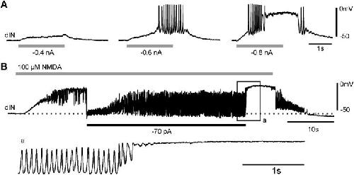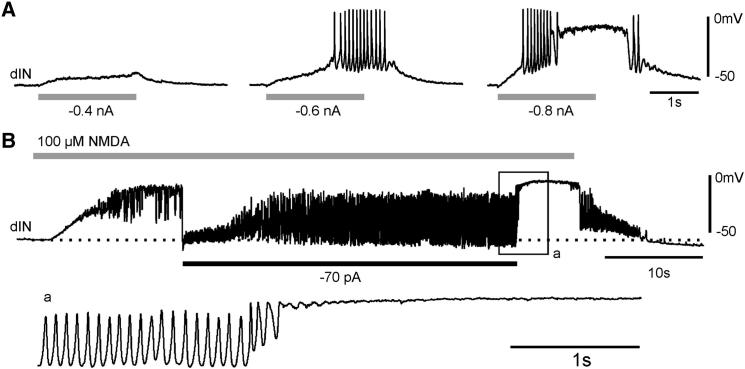 Figure 7. Hyperexcitation Blocks dIN Pacemaker Properties(A) The responses of a dIN to three consecutive applications of NMDA at different microiontophoresis currents (gray bars). The right hand trial results in repetitive firing followed by seizure-like depolarization.(B) A dIN’s response to microperfusion of 100 μM NMDA in TTX (gray bar). Injecting hyperpolarizing current (−70 pA) into the dIN reveals reliable oscillations, which quickly change to seizure-like depolarization at the current withdrawal. The boxed area (a) is expanded below. The dotted line indicates the resting membrane potential level. |