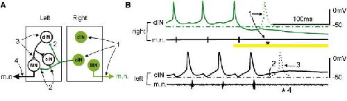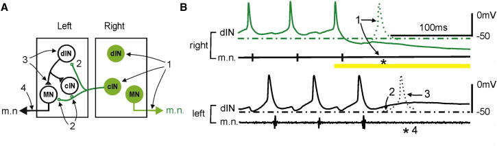 Figure 8. Failure in dIN Rebound Firing May Underlie the Cessation of Swimming after One-Sided Silencing(A) A simplified swimming circuit (circle inhibitory, triangle excitatory, synapses).(B) Simultaneous recordings from a right and a left dIN and also a left m.n. To explain the sequence of events after light silencing, the timing of right m.n. bursts is shown schematically. Dashed lines indicate resting membrane potential levels. Dotted traces in (B) of whole-cell recordings show predictions of the sequence of events (1–4, cf. A) if light illumination (yellow bar) had failed to inhibit the activity in cycle 0 on the GFP+ side (green symbols and traces). Asterisk indicates the timing of m.n. bursts had they occurred. See the main text for more details. |