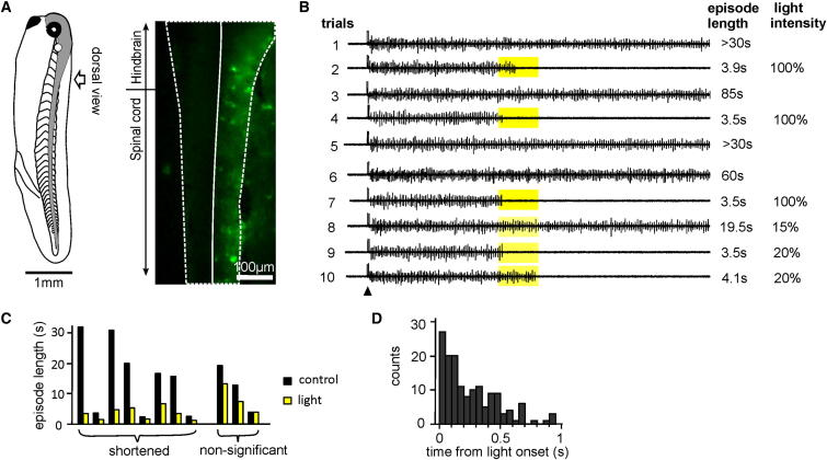 Figure 1. Activation of ArCh in Neurons on One Side of the Tadpole Stops Swimming(A) Left: diagram of a stage 37/38 tadpole viewed from the side; the CNS is shown in gray. Right: ArCh-GFP expression in a tadpole at the same stage after injecting ArCh cRNAs into a blastomere at the two-cell stage. The preparation is viewed from above, after removing the skin and muscle; the right (GFP+) and left sides of the CNS are delineated.(B) Ten consecutive trials showing the effect of 1 s periods of illumination on swimming episode length for the tadpole in (A) (recordings are from the left m.n.). Arrowhead points at time of skin stimulation. One hundred percent light intensity is 10 mW/mm2.(C) Average episode lengths with illumination in eight out of 11 tadpoles (paired columns) were significantly shortened. The first pair of columns on the left is a summary of data in (B).(D) Distribution of the time taken for a 1 s period of illumination to stop swimming in 149 successful trials. |