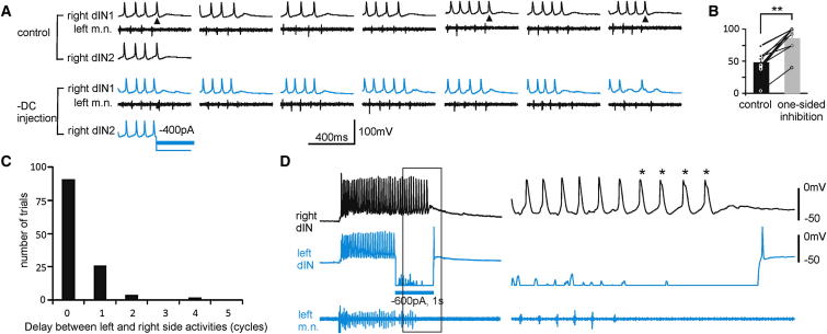 Figure 3. Activity Normally Stops First on the Silenced Side(A) The activity on both sides in the last few cycles in the control and when the right side dINs were injected with −DC (seven trials each, dIN2 activity only shown for the first trial). Arrowheads in the control point to examples where the left side activity stops first.(B) Percentages of control swimming episodes with activity ending first on the left (black) and of trials with activity stopping first on the inhibited side in one-sided silencing (gray). ∗p < 0.05, ∗∗p < 0.01.(C) The distribution of delay between left and right side activity in 123 trials in which activity stopped first on the suppressed side. A half-cycle delay is represented by “0.”(D) One of the two trials in which dIN activity on the opposite side carried on for four more “cycles” (∗, cf. C) after the activity on the suppressed left side has stopped. Recordings on the right are expanded from the boxed area. Recording of the left dIN during −DC was off scale. |