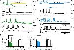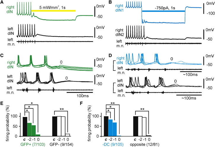 Figure 4. The Firing Probability of Neurons before and during One-Sided Silencing(A) Simultaneous recordings from a dIN on each side of the cord and also from a left m.n. to show the effect of illumination (yellow bar).(B) Simultaneous recordings from two other dINs and left m.n. with −DC injection into dIN1 (blue bar).(C) Five superimposed examples showing the firing of two dINs at the end of episodes in which light stopped swimming within three cycles.(D) Five superimposed recordings of a dIN from the side with −DC injection (blue, top traces) and of another dIN from the opposite side in a separate recording (bottom traces). The recording of the dIN injected with −DC is not shown. In (C) and (D), traces are aligned to the last m.n. bursts and some traces are rescaled horizontally for clarity. Cycle 0 is the period after the last m.n. burst. In (A–D), green traces are recordings from the GFP+ side; blue traces are recordings from the side with −DC injections.(E and F) Summary of the average firing probability in the last three cycles and controls (c is the average of five cycles before silencing). Numerals in brackets are number of cells/trials. We define firing probability of an individual neuron as the percentage of swimming cycles with neuronal firing.See also Figure S1. |