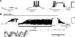 Figure 6. dIN Pacemaker Firing in an Intact Tadpole and Recovery of Motor Rhythms after Inhibition Blockade(A) The activity of a dIN during swimming in an intact tadpole (left) and after short NMDA applications using microiontophoresis (1.3 nA for 2 s, gray bars). The short period of voltage-clamp recording is marked (arrowed line).(B) NMDA-application trials (1â3) in (A) at a faster time scale. The dIN only fires a single spike to DC injections either before (100 pA) or after (200 pA, black bar) trial 3. Note the absence of m.n. activity and fast synaptic currents in NMDA application trials.(C) The activity of a dIN in control swimming in a tadpole cross-sectioned at the fifth and sixth rhombomere levels.(D) dIN and m.n. activity at different time after bath-applying 2.5 μM strychnine and 20 μM SR95531. Recovery period for motor rhythms in this tadpole is 12 min. Arrows indicate time of skin stimulation (artifacts reduced for clarity). |