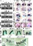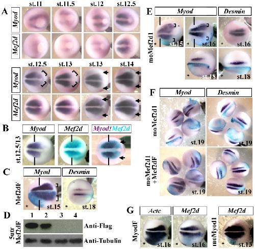 Figure 2. Mef2d drives lateral Myod expression.(A) In situ hybridization of Myod and Mef2d at gastrula and neurula stages realized from time-course experiment with embryos of the same fecondation pool. Brackets show initial posterior Myod expression. (B) Single and double in situ hybridization with Mef2d (blue) and Myod (purple) show that Mef2d precedes Myod expression in the posterolateral domain of presomitic mesoderm (arrows) at stage 12.5/13. (C) Embryos injected unilaterally with 400 pg of Mef2dF mRNA. (D) Western blot with anti-flag and anti-tubulin antibodies of late gastrula embryos injected bilaterally either with 300 pg of 5utrMef2dF synthetic mRNA alone (lane1) or with oligomorpholinos: moControl (lane 2), moMef2d1 (lane3), or moMef2d2 (lane 4). (E) Embryos injected unilaterally with 20 ng of moMef2d1 and submitted to in situ hybridization to detect either Myod or Desmin mRNA. (F) Co-injection of Mef2dF mRNA (200 pg) with moMef2d1 was able to rescue the phenotype of moMef2d1 embryos. (G) Unilateral injection of MyodF mRNA (300 pg) or moMyod1 and detection of Actc and Mef2d expression at stage 16. β-galactosidase mRNA (blue) was co-injected to identify the injected side, indicated by an asterisk (*). Vertical lines define the limit between anterior and trunk regions. Probes are in a framed box and indicated for each panel. Dorsal views. the anterior side of the embryos is on the left; st., stage. For complete statistical data, see supporting information, figure S2. |