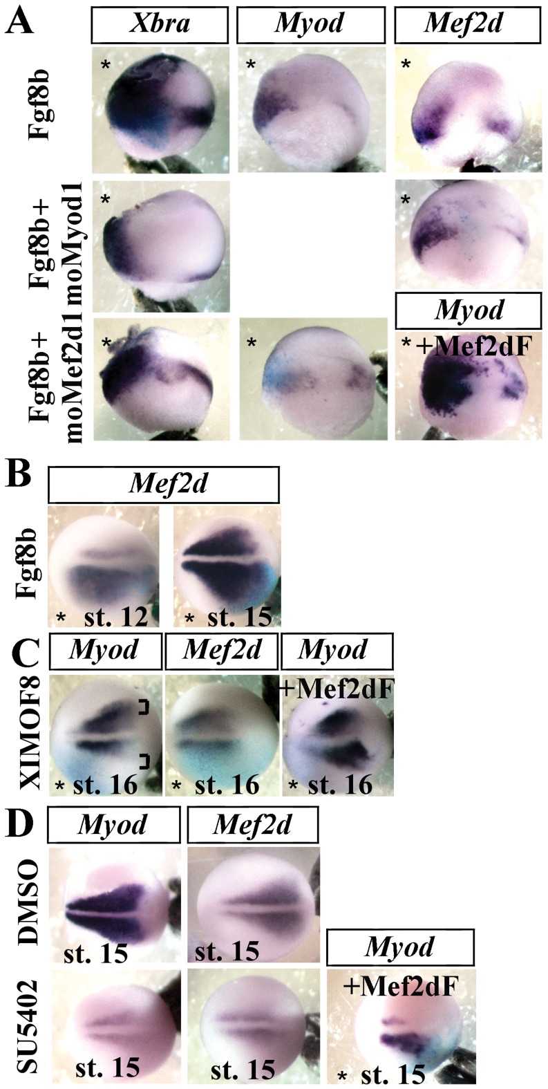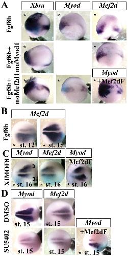 Figure 3. Mef2d is necessary for the activating effect of Fgf on Myod expression at the neurula stage.(A) Embryos were injected unilaterally either with Fgf8b synthetic mRNA alone (5 pg), or with moMyod1 or with moMef2d1, fixed at the gastrula stage and submitted to in situ hybridization for Xbra, Myod or Mef2d. Co-injection of Mef2dF mRNA with moMef2d1 was able to rescue the phenotype of moMef2d1 embryos (+Mef2dF). (B) Unilateral injection of Fgf8b mRNA induced the lateral expansion of Mef2d expression domain at stage 16. (C) Embryos were injected unilaterally with 20 ng of XIMOF8 and fixed at stage 16. Co-injection with Mef2dF mRNA was able to rescue the phenotype of XIMOF8 embryos (+Mef2dF). (D) Embryos were injected at stage 11.5/12 with DMSO or 5 mM SU5402, an inhibitor of Fgf signaling, and fixed at stage 16. A first unilateral injection of Mef2dF mRNA at the two-cell stage was able to rescue the phenotype of treated embryos (+Mef2dF). Injected side (*) at the bottom except in (A), on the left. Bracket indicates the position of lateral myogenic cells. Probes are in a framed box and indicated for each panel. For complete statistical data, see supporting information, figure S2. |