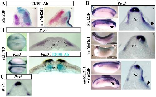 Figure 4. Mef2d is required for dermomyotome formation.(A) Embryos injected unilaterally with 400 pg of Mef2dF mRNA or 20 ng of moMef2d1 were fixed at stage 26 and submitted to staining with the specific muscle 12/101 antibody (red). (B) Expression of Pax7 and Pax3 mRNA at stage 17/18 (dorsal view or transverse sections at the trunk level). Co-staining of Pax3 mRNA (purple) and differentiated muscle cells detected by 12/101 antibody (blue). Dotted lines indicate the position of the medial and lateral population of myogenic cells [5]. (C) Expression of Pax3 mRNA on a transverse section at stage 22. (D) Pax3 mRNA expression on lateral view (left) or on transverse section (right) at the tailbud stage after unilateral injection of Mef2dF or moMef2d1. Rescue experiments restored the phenotype of moMef2d1. Arrows indicate the sites of lateral ectopic expression of Pax3. (*) Injected side. Probes are in a framed box and indicated for each panel. Nc, notochord. For complete statistical data, see supporting information, figure S2. |