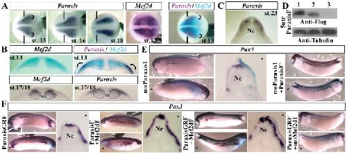 Figure 5. Paraxis and Mef2d have a cooperative effect on dermomyotome formation.(A) Expression of Paraxis mRNA during neurulation. Costaining of Mef2d (blue) and Paraxis (purple) mRNA at stage 13 in comparison with Mef2d expression alone. Rounded brackets indicate the region of colocalization of Paraxis and Mef2d. Dorsal views. The anterior side of the embryos is on the left; st., stage. Vertical lines define the limit between anterior and trunk region. (B) Transverse sections of the costained embryos compared to Mef2d staining at stage 13 (upper panels). Expression of Paraxis and Mef2d at stage 17/18 (lower panels). Dotted lines indicate the position of the medial and lateral population of myogenic cells. (C) Expression of Paraxis mRNA on a transverse section at stage 23. (D) Western blot with anti-flag and anti-tubulin antibodies of late gastrula embryos injected bilaterally either with 300 pg of 5utrParaxis synthetic mRNA alone (lane1) or with oligomorpholinos: moControl (lane 2) or moParaxis1 (lane3). (E) Embryos injected unilaterally with 20 ng of moParaxis1 were submitted to in situ hybridization with Pax3 antisense probe at the tailbud stage (lateral view or transverse section). A co-injection of ParaxisF’ mRNA (150 pg) with moParaxis1 was able to rescue the phenotype of moParaxis1 injected embryos (lateral view). (F) Unilateral injection of ParaxisGRF (150 pg) induced an increase of Pax3 mRNA expression at the tailbud stage. Pax3 expression after co-injection of ParaxisF+Mef2dF or ParaxisGRF+Mef2dF. ParaxisGRF injection with moMef2d1 had no effect on Pax3 expression. (*) Injected side. Probes are in a framed box and indicated for each panel. Nc, notochord. For complete statistical data, see supporting information, figure S2. |