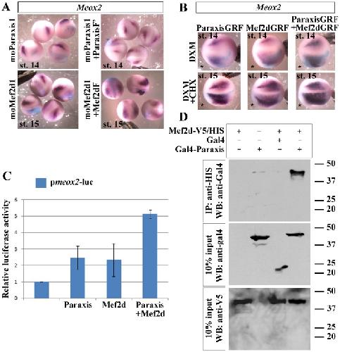 Figure 7. Paraxis and Mef2d targets Meox2 gene in the most lateral part of the presomitic mesoderm.(A) Embryos injected unilaterally with 20 ng of moParaxis1 or moMef2d1 were submitted to in situ hybridization with Meox2 antisense probe at the neurula stage. Injection of either ParaxisF’ mRNA with moParaxis1 or Mef2dF with moMef2d1 was able to rescue the phenotype. (B) Unilateral injection of either ParaxisGRF or Mef2dGRF induced an increase of Meox2 mRNA expression at the neurula stage after induction by dexamethasone (DXM) at stage 12.5. A cooperative effect was observed after co-injection of ParaxisGRF and Mef2dF. A treatment by cycloheximid (CHX) followed by induction by dexamethasone (DXM) at stage 12.5 indicated that Meox2 is a direct target gene of Paraxis and Mef2d. (*) Injected side. Probes are in a framed box and indicated for each panel. (C) COS7 cells were transfected with pmeox2-luc alone, or co-transfected with either Paraxis, Mef2d-V5/His or both and luciferase activity was determined 48 h after transfection. * P<0.01 (D) Protein extracts from COS7 cells transfected with Mef2d-V5/His alone or with either empty vector (Gal4) or Gal4-Paraxis construct were immunoprecipitated (IP) with Ni-NTA beads and subjected to Western blot (WB) using an anti-Gal4 antibody (upper panel). Input control experiments with anti-V5 (lower panel) or anti-Gal4 (mid panel) antibodies. For complete statistical data, see supporting information, figure S2. |