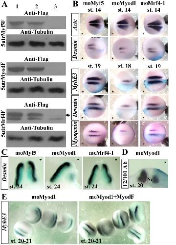 Figure 1. Myod is required for lateral myogenesis.(A) Western blot with anti-flag and anti-tubulin antibodies of gastrula embryos injected bilaterally at the two-cell stage with 300 pg of 5utrMyf5F, 5utrMyodF or 70 pg of 5utrMrf4F synthetic mRNAs alone or with oligomorpholinos. Arrows point out the specific signal. Lane 1: synthetic mRNA alone, 2: synthetic mRNA+moControl, 3: synthetic mRNA+specific mo (moMyf5, moMyod1 or moMrf4-1 with 5utrMyf5F, 5utrMyodF or 5utrMrf4F respectively). (B) Whole-mount in situ hybridization of embryos unilaterally injected with 20 ng of moMyf5, moMyod1 or moMrf4-1 and fixed at stages 14 or 18/19. β-galactosidase mRNA (blue) was co-injected to identify the injected side, indicated by an asterisk (*). Dorsal views. The anterior side of the embryos is on the left; st., stage. (C) Transverse sections of the morphants at stage 26. (D) Transverse section of the Myod morphant submitted to whole-mount immunohistochemistry with the 12/101 antibody. (E) Rescue experiments: Embryos were injected unilaterally with 20 ng of moMyod1 alone or co-injected with synthetic mRNA coding for MyodF (150 pg) and probed with MyhE3. Nc, notochord. Probes are in a framed box and indicated for each panel. For complete statistical data, see supporting information, figure S2. |