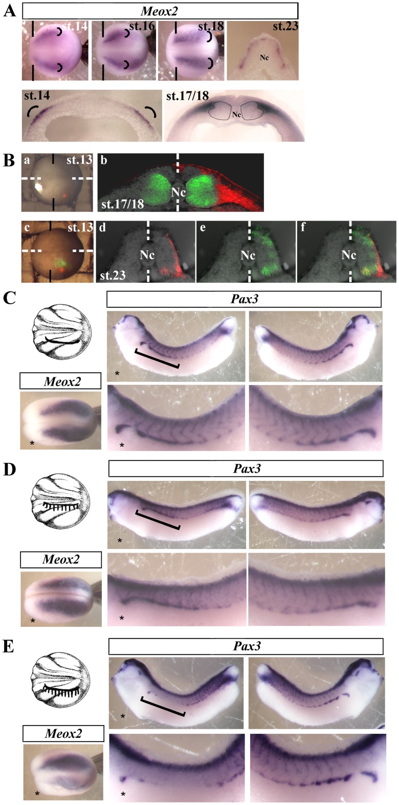 Figure 6. Lateral presomitic cells expressing Meox2 are the dermomytome progenitors.(A) Expression of Meox2 mRNA in the most lateral region (rounded brackets) of presomitic mesoderm at stage 14 (dorsal view and transverse section), 16 (dorsal view), 17/18 (dorsal view and transverse section) and 23 (transverse section). Dotted lines indicate the position of the medial and lateral population of myogenic cells. Vertical lines define the limit between anterior and trunk region. Nc, notochord. (B) Lineage tracing experiments: embryos were injected with WGA-rhodamine (red) in the most lateral presomitic mesoderm (a) or co-injected with WGA-fluorescein (green) in the lateral presomitic mesoderm (c) at stage 13. Transverse sections of the embryo at the trunk level and at stages 18 or 23; embryo injected with WGA-rhodamine and submitted to indirect immunofluorescence with 12/101 antibody followed by secondary Alexa fluor 488 anti-mouse antibody (green) (b) or injected with the both tracers (d, e and f). WGA-rhodamine fluorescence (d), WGA-fluorescein fluorescence (e), merge (f). Dotted lines indicate the bilateral symmetry plan. In (a) and (c): Vertical lines define the limit between anterior and trunk region. (a) and (c) dorsal views, anterior side on the left. (C, D and E). Ablation experiments of presomitic mesoderm at stage 14. After microdissection experiments, embryos were fixed at stage 19 or at the tailbud stage to analyze meox2 and pax3 expression respectively. (C) sham-operated embryos, ectoderm was incised at the lateral level (line), ectoderm and mesoderm were separated from each other on the lateral side, but mesoderm was not removed. (D) Same operation on the mediolateral level but superficial mesoderm was removed (hatched zone) (E) Same operation on the lateral level but superficial mesoderm was removed (hatched zone). Brackets show the axis level corresponding to incision. For complete statistical data, see supporting information, figure S2. |