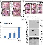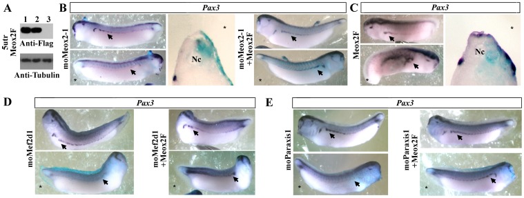 Figure 8. Meox2 acts downstream of Paraxis and Mef2d on dermomyotome formation.(A). Western blot with anti-flag and anti-tubulin antibodies of late gastrula embryos injected bilaterally either with 300 pg of 5utrMeox2F synthetic mRNA alone (lane1) or with oligomorpholinos: moControl (lane 2) or moMeox2-1 (lane3). (B) Embryos injected unilaterally with 20 ng of moMeox2-1 were submitted to in situ hybridization with Pax3 antisense probe at the tailbud stage (lateral view or transverse section). A co-injection of Meox2F mRNA with moMeox2-1 was able to rescue the phenotype of moMeox2-1 (lateral view). (C) Pax3 mRNA expression on lateral views and section of embryos at the tailbud stage after unilateral injection of Meox2F (200 pg). (D, E) Pax3 mRNA expression on lateral view of embryos at the tailbud stage after unilateral injection of moMef2d1(D) or moparaxis1 (E). Rescue experiments by Meox2F (100 pg) restored the phenotype of moMef2d1 (D) and moparaxis1 (E) morphants. Arrows indicate hypaxial expression of Pax3. (*) Injected side. Nc, notochord. For complete statistical data, see supporting information, figure S2. |