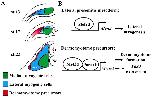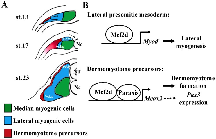 Figure 9. Schematic representation of myotome and dermomyotome formation in Xenopus.(A) The most lateral Meox2 expressing cells of the paraxial mesoderm give rise to the dermomyotome (De) whereas the lateral myogenic cells give rise to a dorsomedial (DoMe) and a ventrolateral (VeLa) cell population. The medial myogenic cells differentiate first and remain associated with the notochord [5]. Arrows design the movement of lateral paraxial mesoderm. Dotted arrows design the movement of invagination of neurectodermal cells. NT, neural tube. Nc, notochord. (B) Mef2d couples lateral myogenesis to dermomyotome formation: In lateral presomitic cells, Mef2d transactivates the Myod gene and in the most lateral presomitic cells Mef2d and Paraxis transactivates the Meox2 gene. |