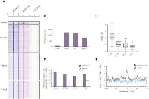 Figure 2. Characteristics of identified putative distal regulatory elements. (A) Heat maps showing the distribution of H3K4me1/me3 and H3K27ac tags −5kb/+5kb relative to the PDRE center at four developmental stages. (B) The number of PDREs identified at dome (blastula) stage is considerably lower than the number of PDREs identified at 80% epiboly or 24/48 hpf, in line with reduced tissue complexity of blastula embryos. (C) Box plots showing the distribution of PDRE length at four examined developmental stages. The PDREs identified at dome stage are considerably larger than the ones identified at subsequent stages, possibly due to a more relaxed chromatin conformation present during early embryogenesis. (D) Conservation of identified PDREs as judged by genomic overlaps with regions conserved to teleosts (sticklebacks) and humans. Approximately 40% and 20% of PDREs overlap with regions conserved in sticklebacks and humans, respectively. (E) The identified PDREs are significantly enriched (Kolmogorov-Smirnov test, P-value < 0.00001) for developmental genes, indicative of a role these sequences might play in early development.
