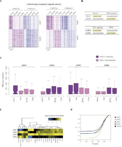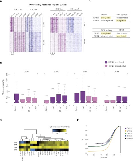 Figure 3. H3K27 differentially acetylated regions. (A) K-means clustering (k = 2) of regions differentially acetylated between subsequent developmental stages. The H3K4me1 mark follows the dynamics of H3K27ac; however, it disappears after H3K27ac has already disappeared (DAR1) (left panel). Similarly to regions differentially acetylated between dome and 80% epiboly, in later DARs, the H3K4me1 mark follows H3K27ac and even precedes H3K27ac on certain genomic locations (DAR4). (B) A schematic representation of different DARs; terms “acetylated” and “deacetylated” correspond to genomic locations identified by Fisher's exact test as differentially enriched for H3K27ac between two subsequent stages. (C) Distribution of gene expression intensities (RNA-seq reads normalized for gene length) displays an overall positive correlation with H3K27ac deposition on enhancer elements at all stages. The H3K27 acetylated DARs are found in the vicinity of highly expressed genes. (D) Hierarchical clustering of motif occurrence in differentially acetylated regions. The frequency of all JASPAR vertebrate motifs in the four DAR clusters was compared to the frequency in all PDREs. All motifs significantly overrepresented (P < 0.05, hypergeometric test in combination with Benjamini-Hochberg correction) in at least one DAR cluster were combined and clustered. (Yellow) Overrepresentation compared to all PDREs; (blue) underrepresentation. (E) Cumulative frequency (Cf) of DARs was plotted against average phastCons (PC) conservation scores that were calculated for each DAR. Each point on the graph represents the frequency of DARs with that of a lower PC score. The frequency of dome (−) 80% epi (+) DARs with a PC score 0 is 0.43, whereas that number is considerably higher (0.59) for dome (+) 80% epi (−) DARs, making them, therefore, less conserved. The black dotted lines correspond to the range of conservation of random DNA.