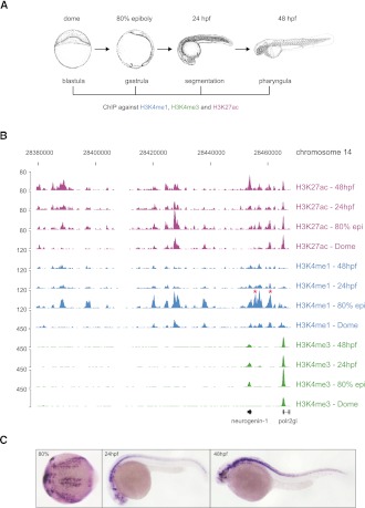 Figure 1. Genomic locations of H3K27ac, H3K4me1, and H3K4me3. (A) A schematic representation of zebrafish early development. H3K4me1/me3 and H3K27ac were immunoprecipitated at the described stages. (B) UCSC Genome Browser view of H3K27ac, H3K4me1, and H3K4me3 tracks obtained for four zebrafish developmental stages: dome, 80% epiboly, 24 hpf, 48 hpf. (Red asterisks) Previously described neurog1 enhancers. (C) Endogenous expression pattern of neurog1 at 80% epiboly, 24-hpf, and 48-hpf zebrafish embryos driven by H3K4me1/H3K27ac-marked transcriptional enhancers. The transcript is localized along the central nervous system (forebrain, midbrain, hindbrain, and spinal cord).