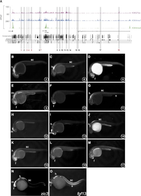 Figure 5. Enhancer activity of PDREs analyzed in stable (F1) zebrafish transgenic lines. (A) Distribution of H3K4me3, H3K4me1, and H3K27ac tracks along 500 kb spanning the zic3 locus at 24 hpf. Shaded in gray are 18 PDREs assayed for enhancer activity in zebrafish transgenic embryos. These PDREs show different degrees of evolutionary conservation as indicated by the conservation tracks below. Out of 18 tested regions, six regions did not exhibit enhancer activity (red numbers). (B–O) Lateral views of 24-hpf zebrafish embryos. (B–M) GFP expression driven by the PDREs indicated in the lower right corner of each panel. (N,O) Expression patterns of zic3 and fgf13a genes at the same stage. Forebrain (f); midbrain (m); hindbrain (h); otic vesicle (ov); spinal cord (sc), notochord (n) and somites (s).