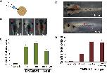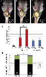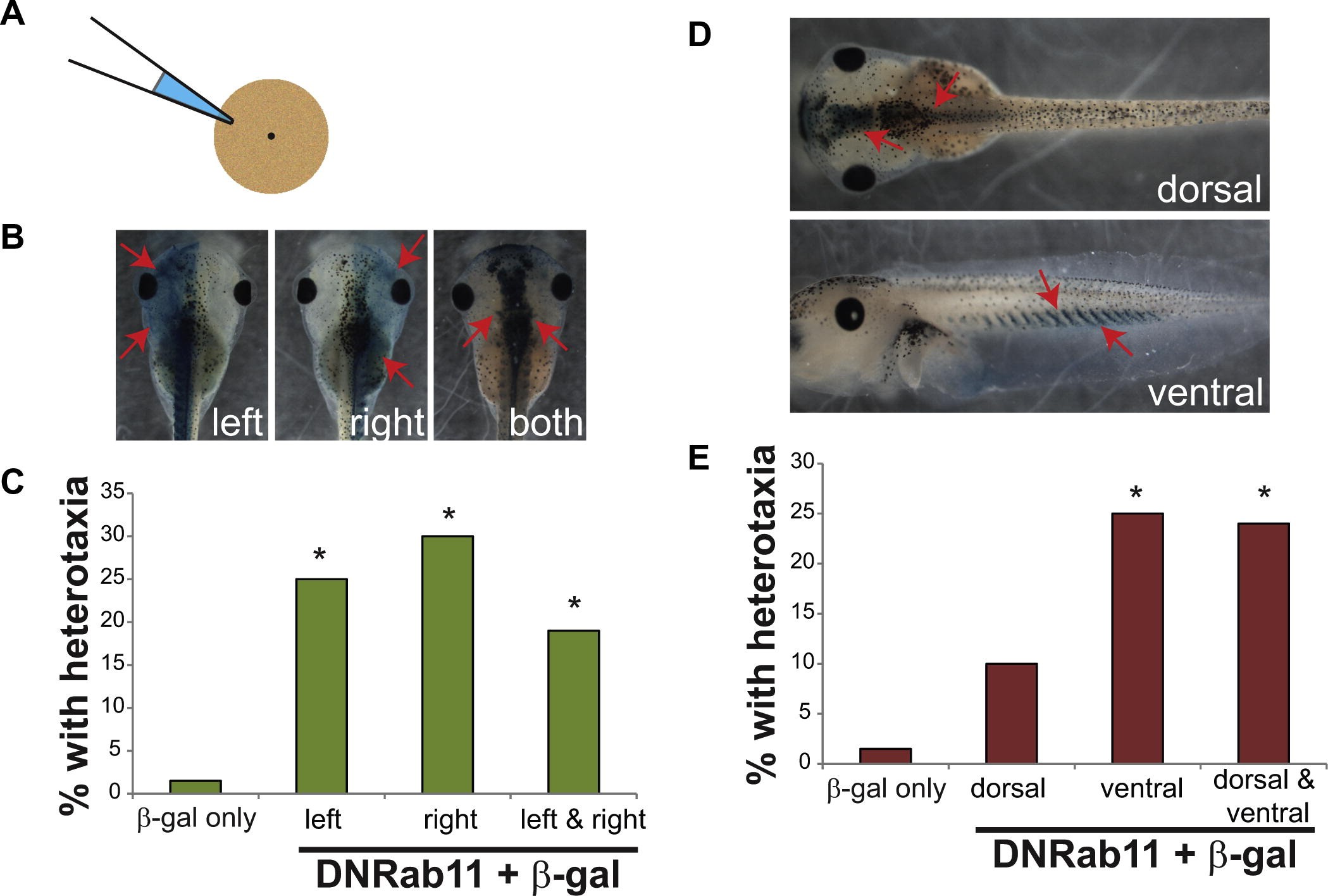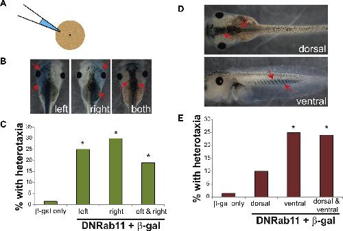 Fig. 2 DNRab11 alters LR patterning, regardless of where it is expressed, if injected at 1-cell. (A) 1-cell embryos were coinjected in a purposefully biased manner with DNRab11 and a b-gal lineage tracer, or injected with b-gal alone. In this schematic, the dot represents the north pole (animal-most point) of the embryo, and the needle shows an example of a biased injection location. These embryos were used to compare left/right (B, C) and dorsal/ventral (D, E) patterns of b-gal expression. (B) Embryos were raised to stage 45 and scored for situs of organs. Then, localization of b-gal expression (indicated by red arrows) was utilized to indicate whether the injections were targeted to the left, right, or both sides of the embryo. (C) Similar rates of heterotaxia were observed regardless of whether DNRab11 was targeted to the left, right, or both sides of the embryo. *p < 0.001 compared to controls injected with b-gal alone (X2 test). (D) Similar to what was done for LR localization, embryoswere examined to determine whether the localization of b-gal expression (indicated by red arrows) was limited to dorsal, ventral, or both structures. (E) DNRab11 was effective at randomizing the LR axis when targeted to dorsal, ventral or both structures, although statistical significance was only achieved when DNRab11 was targeted to ventral structures. *p<0.001 compared to controls injected with b-gal alone (X2 test). |