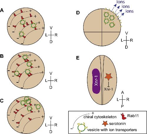 Fig. 7 Experimental results support an assembly-line model of Rab11-mediated vesicular traffic in the ion flux model of LR asymmetry. Schematic representation of the assembly line model of Rab11-mediated transport of vesicles in the early embryo. (A) Rab11 associates with ion transporter-containing vesicles throughout the embryo. (B) Rab11 molecules attached to vesicles move toward the + end of the cytoskeletal structure for a short distance, and then dissociate from the vesicles. Other Rab11 molecules then attach to the vesicles in the exchanges shown. (C) Vesicles containing ion transporters accumulate in the right ventral cell, but Rab11 remains distributed evenly, as indicated by the relatively symmetric expression of endogenous Rab11 mRNA and protein (Fig. 4). (D) The biased localization of ion transporters establishes the asymmetric bioelectrical properties that have been reported previously in early Xenopus embryos. The pumping of positive ions out of the right ventral cell causes it to be relatively more negative than other blastomeres. (E) Membrane voltage and pH gradients drive the asymmetric localization of serotonin, a positively charged molecule, by the 32-cell stage (not shown). Serotonin localized to the right side of the embryo actively suppresses Xnr-1 expression on the that side at stage 22. |