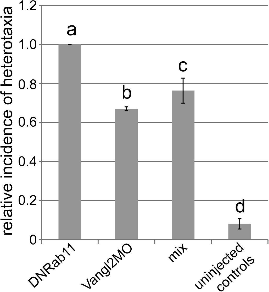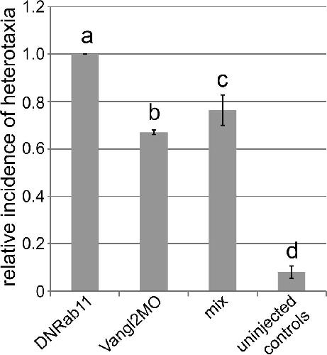 Fig. 3 Rab11 acts cooperatively with planar cell polarity (PCP) in LR patterning. Previous studies indicate that altering expression of the PCP protein Vangl2 via morpholinos (Vangl2MO) disrupts LR patterning (Vandenberg and Levin, 2012). Epistasis experiments were conducted to determine whether Rab11 acts on the same LR pathway as PCP. DNRab11 mRNA, Vangl2MO and a mixture of the two treatments were tested for their effects on organ situs; three replicates were examined and data were normalized to the incidence of heterotaxia induced by DNRab11 to allow for comparisons between treatments. Both DNRab11 and Vangl2MO induced significant levels of heterotaxia compared to untreated controls. A mixture of the two reagents produced intermediate levels of heterotaxia. ANOVA p < 0.001, different letters indicate significant differences (p < 0.05) in Bonferroni posthoc analysis. |