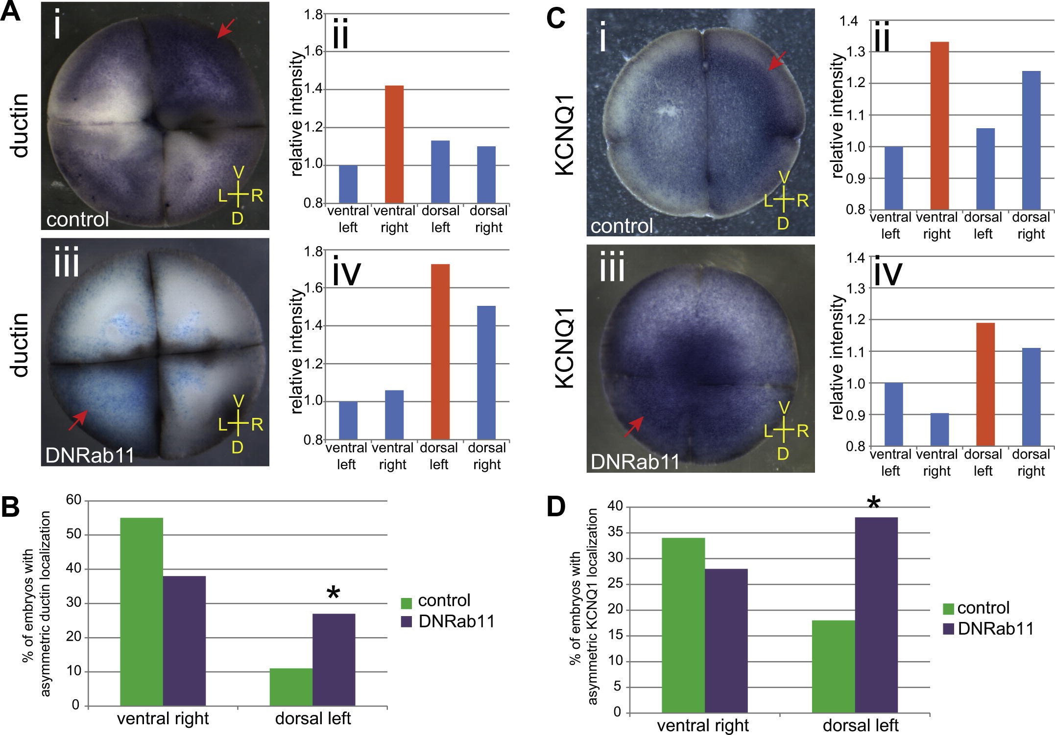 Fig. 6 DNRab11 alters asymmetric ion transporter localization at the 4-cell stage. (A) 4-cell embryos were oriented, sectioned, and immunostained for ductin protein. Biases in expression were quantified by identifying the strongest expressing blastomere(s). The control embryo shown (i) has the strongest expression in the ventral right cell, verified with ImageJ thresholding tools (ii). The embryo injected with DNRab11 shown (iii) has the strongest expression in the dorsal left cell, verified with ImageJ thresholding tools (iv). (B) A total of 110 control and 45 DNRab11-injected embryos were quantitatively analyzed. In controls, the most common blastomere scored as having the highest expression of ductin was the ventral right; ventral right localization was decreased in DNRab11 injected embryos, although this decrease did not reach statistical significance. Dorsal left expression was rare in control embryos, and the incidence of dorsal left expression was significantly higher in DNRab11-injected embryos (*p < 0.05). (C) The same protocol was used for identifying biases in the expression of KCNQ1. The control embryo shown (i) has the strongest expression of KCNQ1 in the ventral right cell, verified with ImageJ thresholding tools (ii). The embryo injected with DNRab11 shown (iii) has the strongest expression in the dorsal left cell, verified with ImageJ thresholding tools (iv). (D) A total of 85 control and 40 DNRab11-injected embryos were quantitatively analyzed. In controls, the most common blastomere scored as having the highest expression of KCNQ1 was the ventral right; ventral right localization was decreased in DNRab11 injected embryos, although this decrease did not reach statistical significance. Dorsal left expression was relatively rare in control embryos, and the incidence of dorsal left expression was significantly higher in DNRab11-injected embryos (*p < 0.05). |