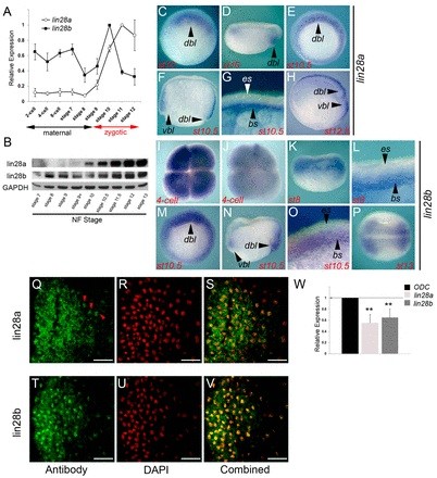 Fig. 1. Expression of lin28a and lin28b in the X. tropicalis embryo. (A,B) Temporal expression profiles of lin28a and lin28b mRNA (A) and protein (B) in early cleavage to late gastrula stage embryos as assessed by Q-PCR and western blot, respectively. (C-P) Spatial expression of lin28a (C-H) and lin28b (I-P) as assessed by in situ hybridisation. (C,E,M) Vegetal view; (D,F,H,K,N) transverse sections, lateral view; (G,L,O) higher magnification of F, K and N, respectively; (J) vegetal view of I. Stages are indicated: stage 8, mid-blastula; stage 10 to 10.5, early gastrula; stage 12.5 to 13, late gastrula. dbl, dorsal blastopore lip; vbl, ventral blastopore lip; es, ectodermal superficial layer; bs, basal sensorial layer. (Q-V) Fluorescence microscopy of cryosections from the circumblastoporal region of early gastrula stage 10.5 embryos. (Q) Immunolocalisation of lin28a expression. Red arrows indicate nuclear enrichment. (R) Nuclear DAPI staining in same section as Q. (S) Merge of Q and R. (T) Immunolocalisation of lin28b expression. (U) Nuclear DAPI staining in same section as T. (V) Merge of T and U. (W) Expression levels of lin28a, lin28b and the ubiquitously expressed housekeeping gene ornithine decarboxylase (ODC) in dnFGR4-injected embryos as compared with control embryos by Q-PCR. Solid line represents mRNA levels in corresponding control embryos (set at 1). **P<0.005 (Student t-test), for expression in experimental embryos compared with control embryos. Error bars indicate s.d. Scale bars: 50 μm.