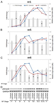 Effects on the temporal regulation of nodal-related pathway components in lin28 morphants. (A-C) Temporal expression profiles of nr1 (A), nr5 (B) and nr6 (C) from NF blastula stage 7+ to gastrula stage 11 as assessed by Q-PCR in control and lin28 morphant X. tropicalis embryos. Relative expression levels were calculated as the proportion of the maximum expression level in controls (set at 1) and fold change values are expressed relative to controls (set at 1). *P<0.05 (Student t-test), for morphant compared with control expression. (D) Western blot showing the expression levels of p-Smad2 at the NF stages analysed above. GAPDH, loading control. Error bars indicate s.d.