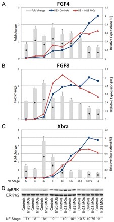 Effects on the temporal regulation of FGF pathway components in lin28 morphants. (A-C) Temporal expression profiles of FGF4 (A), FGF8 (B) and Xbra (C) from NF blastula stage 7+ to gastrula stage 11 as assessed by Q-PCR in control and lin28 morphant X. tropicalis embryos. Relative expression levels and fold change values were calculated as in Fig. 5. *P<0.05 (Student t-test), for morphant compared with control expression. (D) Western blot showing the expression levels of dpERK at the NF stages analysed above. GAPDH, loading control. Error bars indicate s.d.