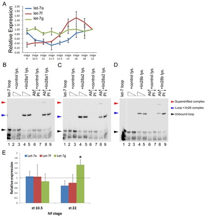 let-7 in Xenopus development. (A) Q-PCR analysis of let-7a, let-7f and let-7g expression from stage 9 to stage 22. Expression is calibrated to stage 22 for each gene. (B-D) RNA EMSA supershifts showing let-7g terminal loop RNA-binding activity of dilutions of protein extracted from Xenopus embryos overexpressing lin28a1 (B), lin28a2 (C) or lin28b (D) proteins. Lane 1, labelled let-7g terminal loop alone; lanes 2 and 3, let-7g plus 1:4 and 1:8 dilutions of control embryo lysate, respectively; lanes 4 and 5, let-7g plus 1:4 and 1:8 dilutions, respectively, of lysate from lin28-overexpressing embryos; lane 6, let-7g plus 1:4 dilution of control embryo plus relevant lin28 antibody; lane 7, let-7g plus 1:4 dilution of control embryo lysate plus relevant pre-immune serum; lane 8, let-7g plus 1:4 dilution of lin28-overexpressing embryo lysate plus relevant lin28 antibody; lanes 9, let-7g plus 1:4 dilution of lin28-overexpressing embryo lysate plus relevant pre-immune serum. (E) Q-PCR analysis of relative expression of let-7 miRNAs in lin28 morphants compared with control embryos at stage 10.5 and 22. Solid line represents miRNA levels in corresponding control embryos (set at 1). *P<0.05 (Student t-test), for morphant compared with control expression. Error bars indicate s.d.