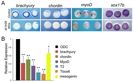 Fig. 3. Effect of lin28 knockdown on mesodermal gene expression. (A) Expression of brachyury, chordin, myoD and sox17b in control and lin28 morphant X. tropicalis embryos assessed by in situ hybridisation at gastrula stage 10.5. (B) Expression of the indicated mesodermal markers in lin28 morphants relative to expression in control embryos as assessed by Q-PCR at stage 10.5. *P<0.05, **P<0.005 (Student t-test), for morphant expression compared with control expression. ODC is a ubiquitously expressed housekeeping gene. Error bars indicate s.d.