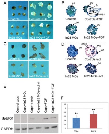 Effect of lin28 knockdown on FGF and activin/nodal signalling. (A,C) Animal cap explants from control and lin28 morphant X. tropicalis embryos, with or without FGF (A) or activin (C) treatment. (B,D) Histology on sections of animal caps from A and C, respectively. ae, atypical epidermis; bl, blood; mes, mesenchyme; ms, muscle. (E) Western blots showing dpERK expression levels in animal cap explants from control and lin28 morphant embryos, with or without activin or FGF treatment. GAPDH, loading control. (F) Expression levels of FGF4 and FGF8 in lin28 morphants at stage 10.5 relative to controls as assessed by Q-PCR. Solid line represents mRNA levels in corresponding control embryos (set at 1). **P<0.005 (Student t-test), for morphant expression compared with control expression. Error bars indicate s.d.