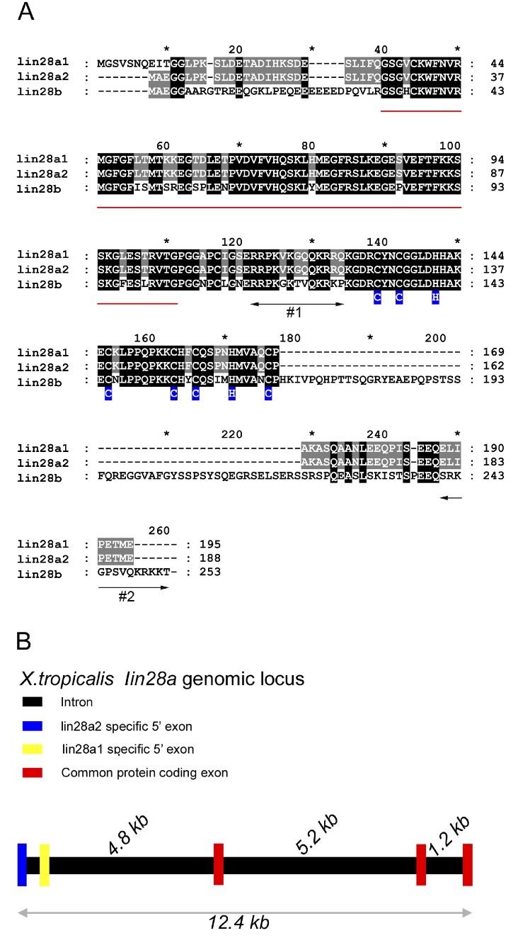 Fig. S1. The lin28 family in X. tropicalis. (A) An alignment of the conceptual peptide sequences for lin28a1, lin28a2 and lin28b. The cold shock domain is underlined in red and the conserved residues of the zinc knuckles are indicated by blue lettering. Conserved nuclear localisation signals #1 and #2 in lin28b are indicated by arrowheaded black lines. (B) The X. tropicalis lin28a genomic locus.