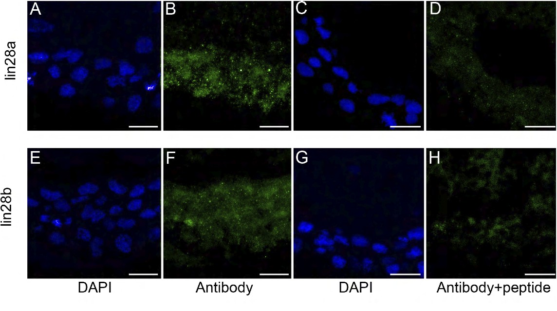 Fig. S2. Peptide competition of lin28 antibody immunoreactivity. Fluorescence microscopy of cryosections from the animal hemisphere region of early gastrula stage 10.5 embryos. (A,C,E,G) Nuclear DAPI staining in sections corresponding to B, D, F and H, respectively. (B) Immunofluorescence in section probed with lin28a antibody. (D) Immunofluorescence in section probed with lin28a antibody in the presence of competing epitope peptide. (F) Immunofluorescence in section probed with lin28b antibody. (H) Immunofluorescence in section probed with lin28b antibody in the presence of competing epitope peptide. The residual fluorescence in D and H results from autofluorescence of yolk in early Xenopus tissues. Scale bars: 50 μm.