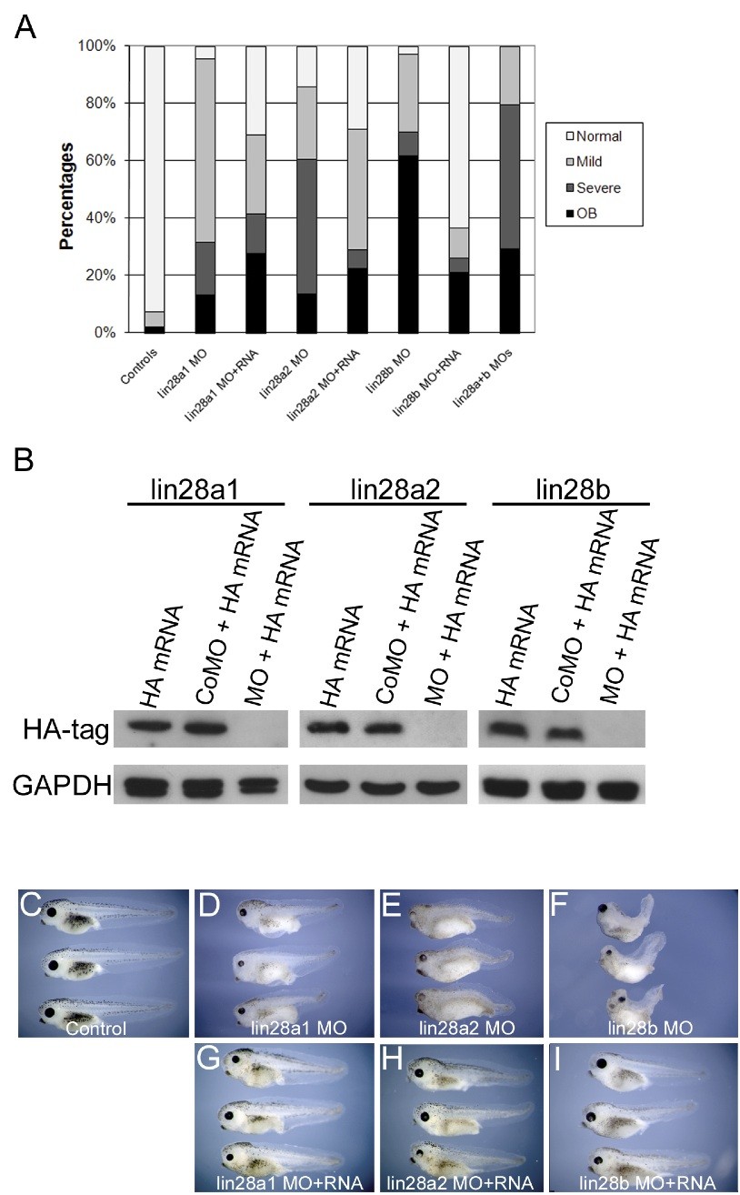 Fig. S3. lin28 knockdown in X. tropicalis. (A) Proportion of the different phenotypes in lin28 morphant embryos, with (rescue) or without co-injection of the corresponding mRNA. (B) Western blot showing HA-tag lin28 protein levels in embryos at stage 18 injected with HA-tag lin28 mRNA (HAmRNA) alone, or co-injected with the corresponding translation-blocking MO or standard control MO (CoMO). GAPDH, loading control. (C-I) Phenotypes of control (C), lin28 morphants (D-F) and their respective rescues by co-injection of the corresponding mRNA (G-I).