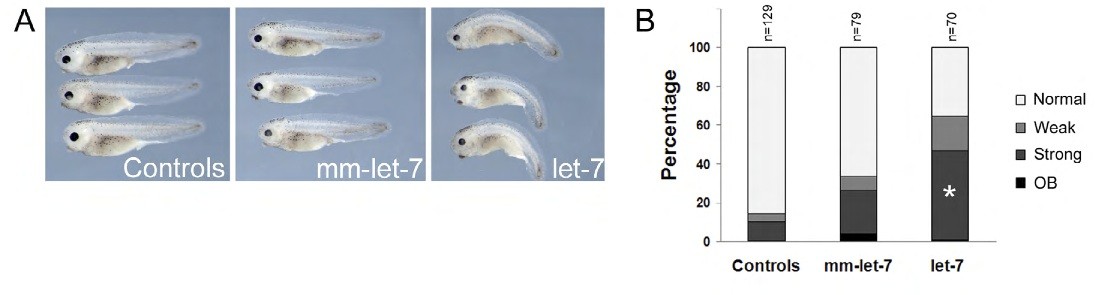 Fig. S4. let-7 overexpression in X. tropicalis. (A) Bent axis defects in embryos injected with 10 μM let-7 duplex but not in embryos injected with a mismatch (mm-let-7) let-7 duplex. (B) Percentages of normal axis, mild axis bending, severe axis bending and OB (open blastopore-related) defects in let-7 or mm-let-7 injected embryos and controls *P<0.05 (Student t-test), for bent axis phenotypes in let-7 injected embryos compared with control and mm-let-7 injected.