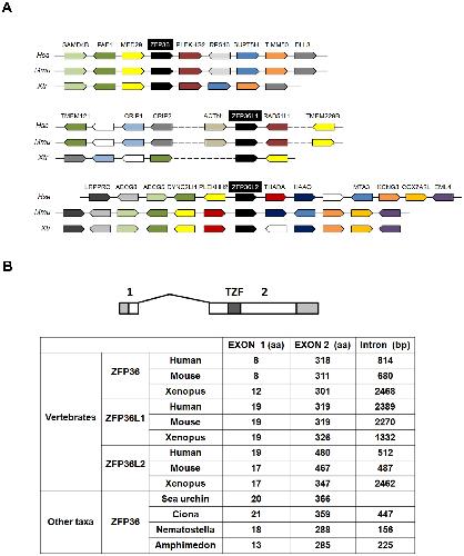 (A) Conserved syntenic regions between human (Hsa), mouse (Mmu) and Xenopus tropicalis (Xtr) chromosome regions containing zfp36, zfp36l1 and zfp36l2. Gene names symbols are according to HUGO. Boxes with the same colour correspond to the same gene; white boxes correspond to genes without annotation or without orthologues in the species shown here. The drawing is not to scale to avoid complexity and dashes represent long chromosome regions. (B) Conserved structural organization of vertebrates zfp36 genes between evolutionary distant animals. Exons (1, 2) are figured in open boxes and intron as a solid line respectively. Shaded box, untranslated region. TZF, Tandem Zing Finger domain.