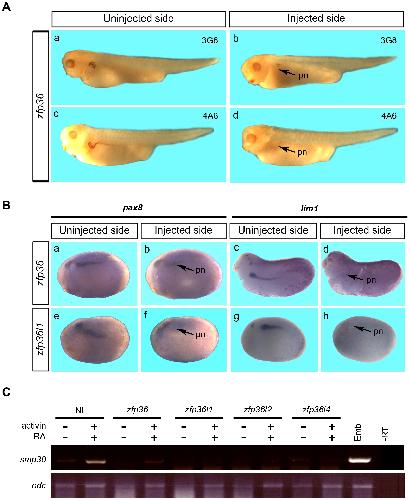 Figure 8. Zfp36 mRNA overexpression alters the formation of pronephros and affects pronephric marker genes expression. (A) 250 pg of Xenopus zfp36 mRNA were injected into one ventral blastomere of 8-cell stage embryos and developing embryos were fixed at stage 39 before immunhistochemistry analysis with the pronephros specific markers 3G8 and 4A6. Arrows in b and d mark the pronephros (pn) alteration on the injected side. (B) 250 pg of Xenopus zfp36 (a) or zfp36l1 (e) mRNA was injected into one ventral blastomere of 8-cell stage embryos and developing embryos were fixed at stage 22 (a, b and e) or stage 26 (c, d) before in situ hybridization analysis for pax8 or lim1 expression. Arrows in b, d, f and h mark the pronephros (pn) alteration on the injected side. (C) Two-cell stage embryos were injected or not (NI) with 250 pg of the different Xenopus zfp36 mRNAs. Animal caps were explanted at stage 8.5 and treated with activin plus retinoic acid (RA) before analysis by RT-PCR for smp30 expression when control embryos reached stage 35. Stage 35 embryo (Emb) or untreated animal caps (-) were assayed by RT-PCR in parallel. Odc was used as control of loading and a reaction was performed in the absence of reverse transcriptase to check for genomic DNA contamination (-RT).