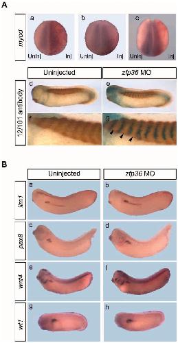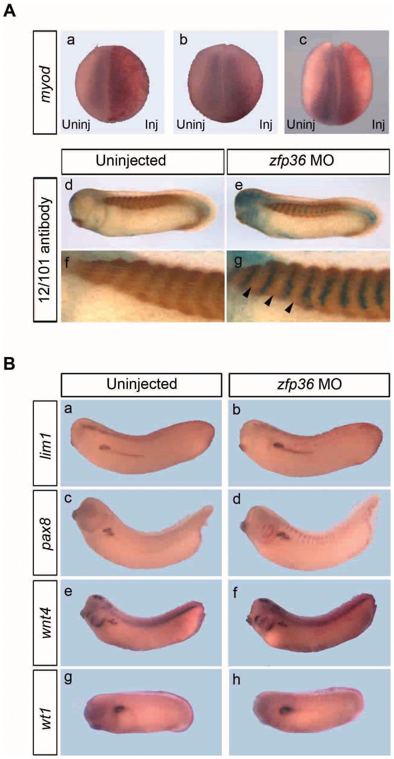 Figure 10. Zfp36 depletion does not affect somitogenesis nor early pronephros specification. (A) 20 ng of zfp36 morpholinos (MO) were injected into one dorsal blastomere of 4-cell stage embryos with 250 pg of lacZ mRNA. Embryos were fixed at stage 15 for the detection of myod by in situ hybridization (a) or at stage 28 for immunohistochemistry with 12/101 antibody (d). a, b and c are representative phenotypes and f and g are close up views of d and e respectively. Arrowheads indicate regularly segmented somites on the injected side. (B) 20 ng of zfp36 morpholinos (MO) were injected into one ventral blastomere of 8-cell stage embryos with 250 pg of lacZ mRNA. Embryos were fixed at stage 29/30 (a, b, e, f), 33/34 (c, d) or 27 (g, h) and analysed for the expression of lim1, pax8, wnt4 and wt1 by in situ hybridization.