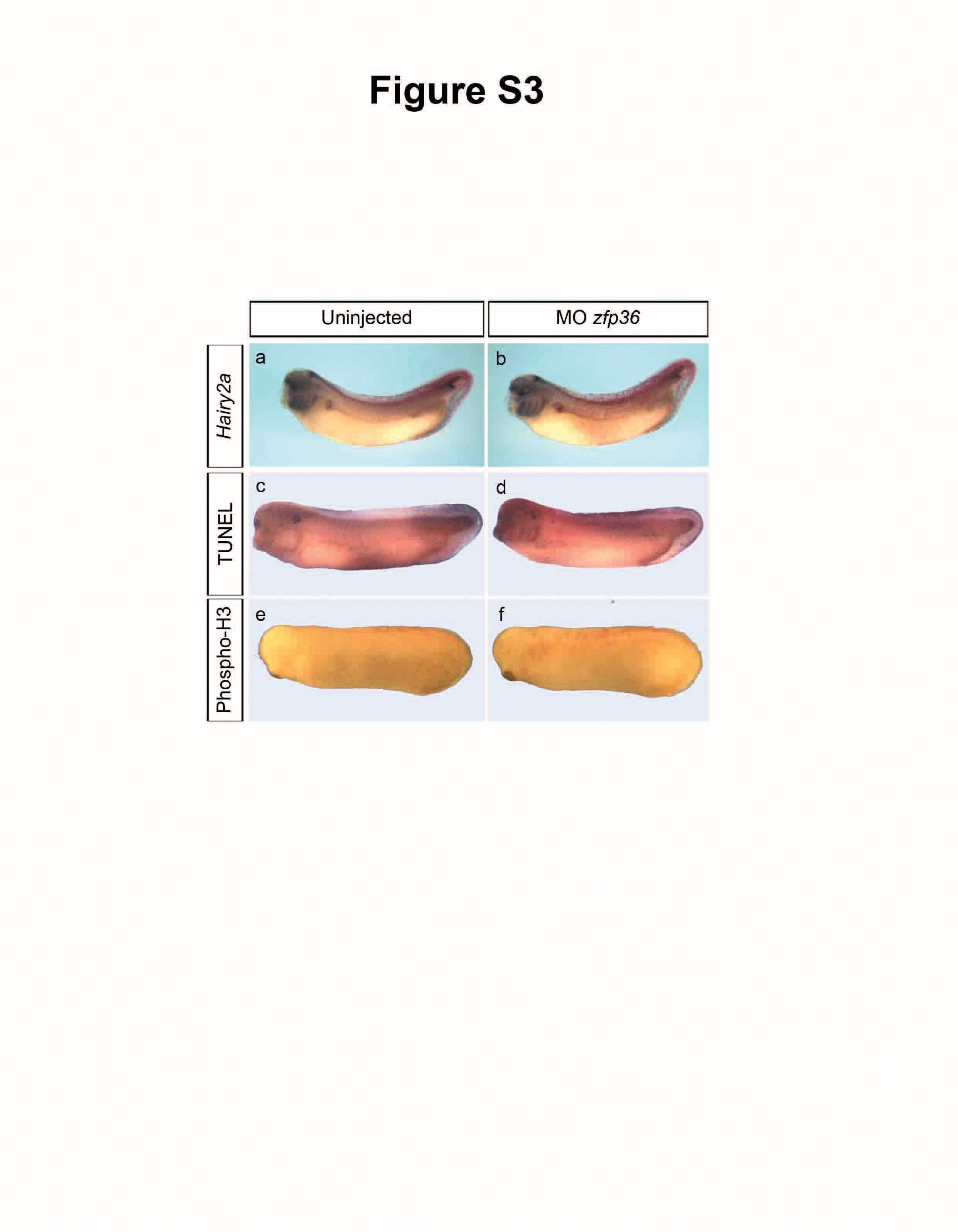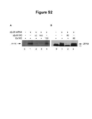 Figure S2. Efficacy of zfp36 mRNA translation inhibition by morpholinos. (A) 500 pg of zfp36 mRNA were in vitro translated in reticulocyte lysate and translation products were analyzed by SDS PAGE followed by autoradiography. Lane 0, mock translation without mRNA; lane 1, no zfp36 MO; lane 2, 50 ng of zfp36 MO; lane 3, 100 ng of zfp36 MO; lane 4, 100 ng of Control (Co) MO. (B) 250 pg of zfp36 mRNA were injected in embryo alone (lane 1) or with 80 ng of zfp36 MO (lane 2) or 80 ng of control MO (lane 3). Embryos were fixed at stage 12 and protein extracts were analyzed by western blot with an anti flag antibody. The migration of zfp36 protein is indicated by an arrow. Lane 0, uninjected embryo. Non specific signal (ns).