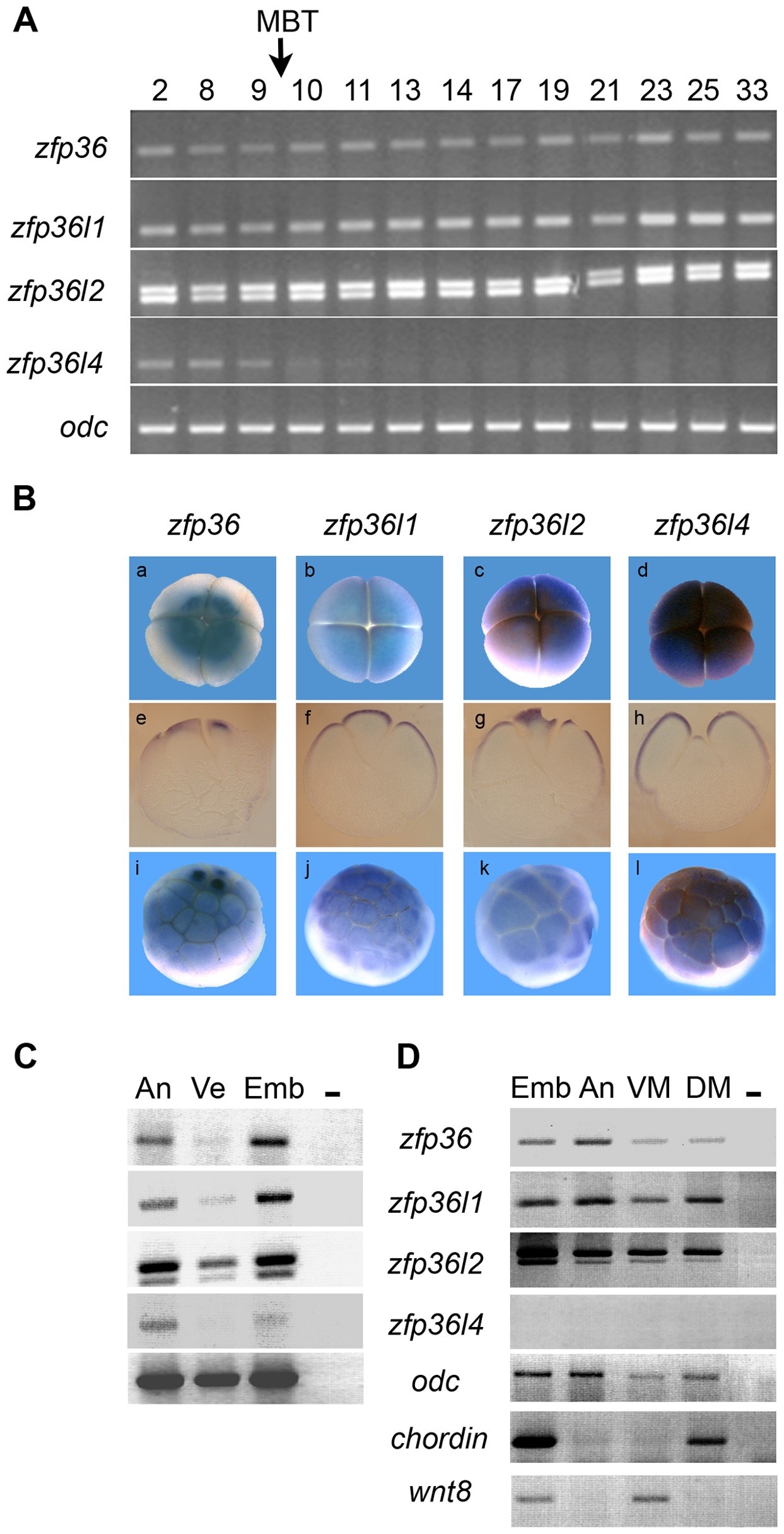(A) RT-PCR analyses showed that all zfp36 genes are maternally expressed. zfp36, zfp36l1 and zfp36l2 mRNAs are expressed at a constant level throughout development from stage 2 to stage 33 while zfp36l4 mRNA level decreases after the mid-blastula transition (MBT, arrow). (B) In situ hybridization showed that all four zfp36 mRNA are localized at the animal pole in 4-cell stage (a) and morula stage (i) embyos. e correspond to histological sections from embryos shown in a. (C) RT-PCR analysis showed that zfp36 mRNAs are preferentially expressed in the animal pole region of blastula embryos. (D) RT-PCR analysis showed that zfp36 mRNAs are expressed throughout the embryo at the gastrula stage. An, animal pole; DM, dorsal marginal zone; Emb, whole embryo; Ve, vegetal pole; VM, ventral marginal zone. A control embryo (Emb) assayed by RT-PCR for the expression of control genes chordin and wnt8. odc was used as control of loading and a reaction was performed in the absence of reverse transcriptase to check for genomic DNA contamination (-).
