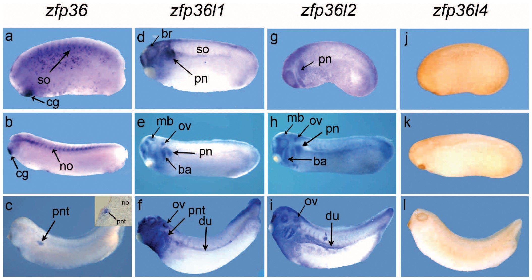 The localization of zfp36 mRNAs was detected by in situ hybridization in embryos from stage 24 (a, d, g, j), stage 28 (b, e, h, k) and stage 35/36 (c, f, i, l). A close up view of a transverse section at the level of pronephros is shown in c. Zfp36l4 expression was never detected in the embryos at any stage. ba, branchial arches; br, brain; cg, cement gland; du, pronephric duct; mb, midbrain; no, notochord, ov; otic vesicle; pn, pronephros anlage, pronephric tubule; so, somites.