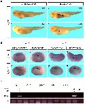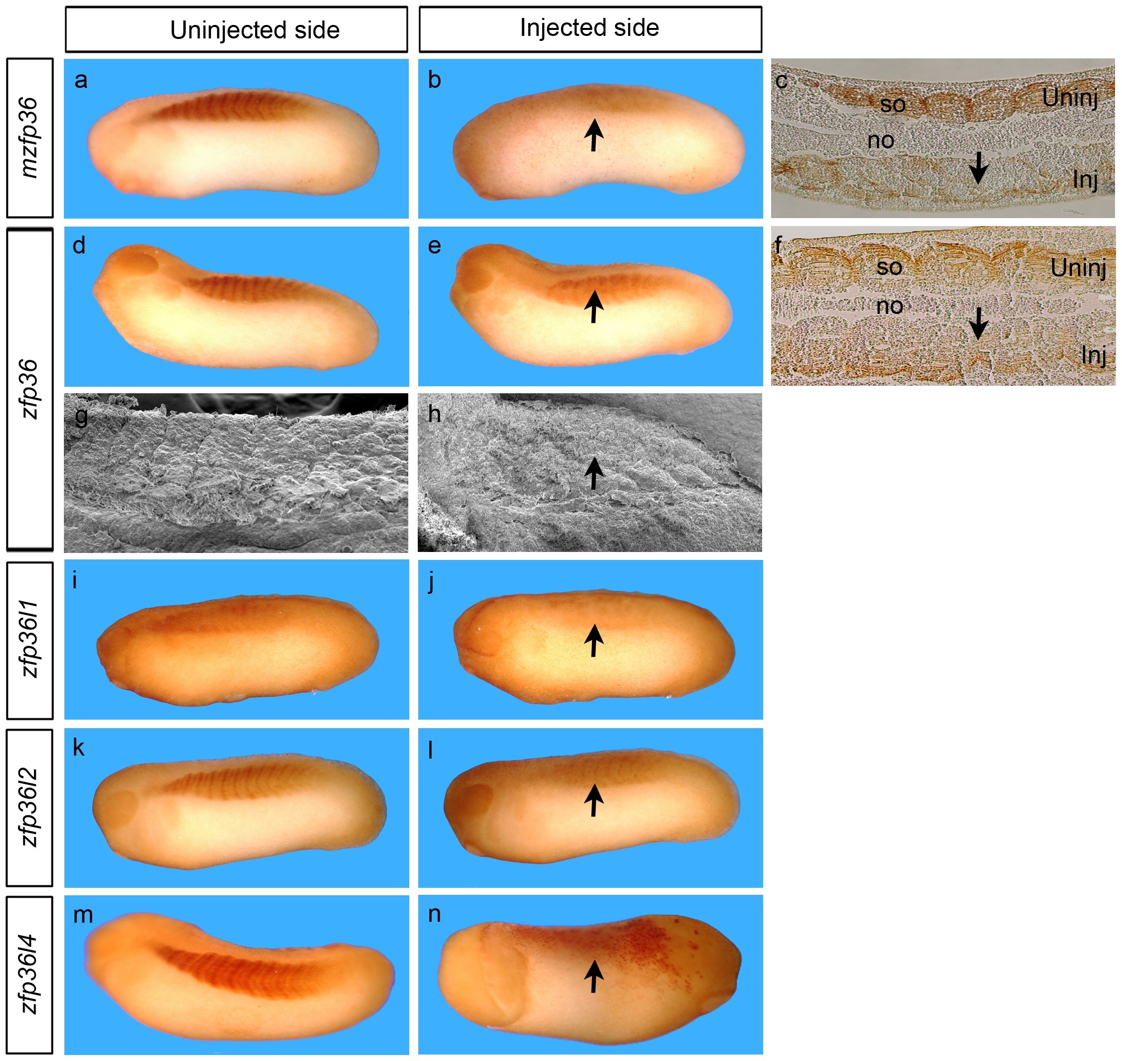 250 pg of mouse zfp36 mRNA (a, b) or Xenopus zfp36 (d, e), zfp36l1 (I, j), zfp36l2 (k, l) or zfp36l4 (m, n) mRNA were injected into one blastomere of two-cell stage embryos and developing embryos were fixed at stage 28 before immunhistochemistry analysis with the somite specific marker 12/101. Embryos were embedded in paraffin then sectioned longitudinally (c, f) or treated for scanning electronic microscopy (g, h). The arrows mark the alteration of segmentation on the injected side (Inj) by comparison with the uninjected side (Uninj). no, notochord; so, somite.