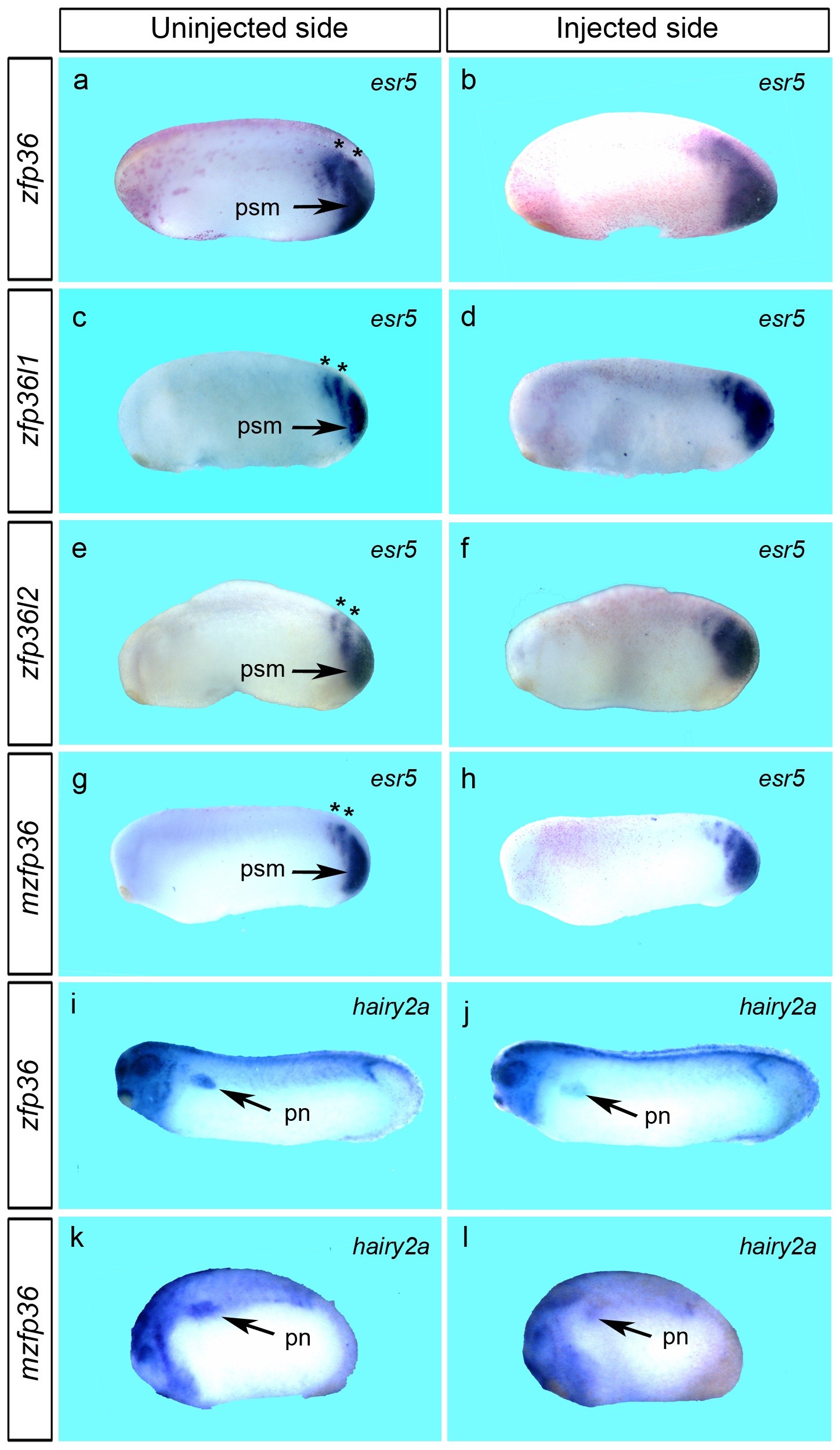 Figure 7. Zfp36 mRNA overexpression alters the expression of notch signalling pathway members esr5 and hairy2a. 250 pg of Xenopus zfp36 (a, b, i, j), zfp36l1 (c, d), zfp36l2 (e, f) or mouse zfp36 (mzfp36, g, h, k, l) mRNAs were injected into one blastomere of two-cell stage embryos and developing embryos were fixed at stage 25 (a and k, l) or stage 28 (i, j) and analyzed by in situ hybridization for esr5 and hairy2a expression. Arrows in a, c, e and g mark the presomitic mesoderm (psm) and the pronephros region (pn) in i respectively. Stars in a, c, e and g mark the first two somitomeres.