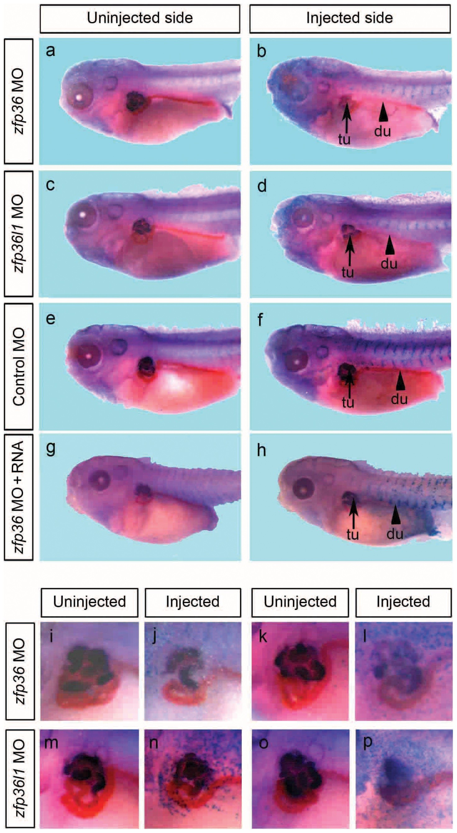 Figure 9. Zfp36 and zfp36l1 morpholino knock down induces pronephros alterations. 20 ng of morpholinos directed against zfp36 (a, b) or zfp36l1 (c, d) mRNAs or control morpholinos (e, f) were injected into one ventral blastomere of 8-cell stage embryos with 250 pg of lacZ mRNA. In rescue experiments, 10000 pg of mouse zfp36 mRNA were co-injected with 20 ng of MO zfp36 (g, h). Developing embryos were fixed at stage 40 before lacZ staining and immunohistochemistry analysis to reveal the expression of pronephros specific markers, 3G8 and 4A6. Arrows and arrowheads in b, d, f and h, mark the pronephros proximal tubule (tu) and duct (du) respectively on injected sides of the embryos. I, Close up views of anterior region showing uninjected or injected sides of representative phenotypes for zfp36 morphants (i) and zfp36l1 morphants (m).