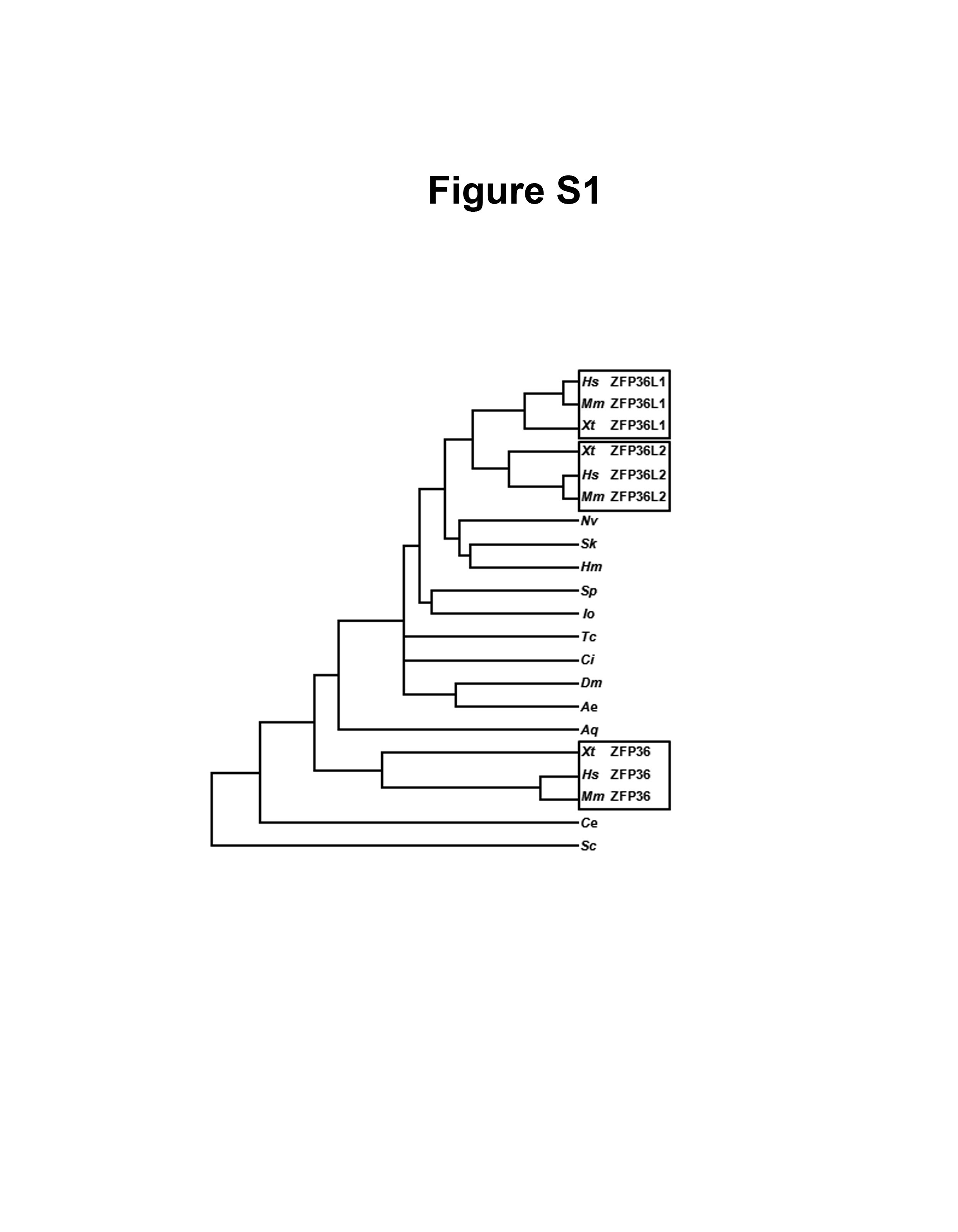 Figure S1. Phylogenetic tree showing the evolutionary relationship between zfp36, zfp36l1 and zfp36l2 genes. The tree was made from the amino acids sequence of the tandem zinc finger domain using mega4 program. Ae, Aedes aegypti; Aq, Amphimedon queenslandica; Ce, Caenorhabditis elegans; Ci, Ciona intestinalis; Dm, Drosophila Melanogaster; Hm, Hydra magnipapillata; Hs, Homo sapiens; Io, Ilyanassa obsoleta; Mm, Mus musculus; Nv, Nematostella vectensis; Sc, Saccharomyces cerevisiae; Sp, Strongylocentrotus purpuratus; Sk; Socoglossus kowalevskii; Tc, Tribolium castaneum; Xt, Xenopus tropicalis.