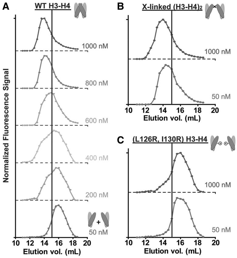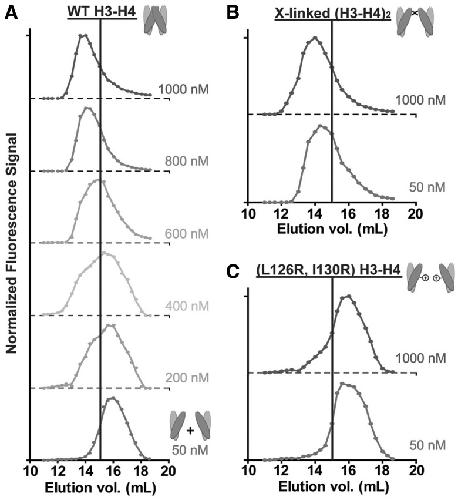 Figure 3. The oligomeric state of the histone H3-H4 complex is dynamic across the nanomolar range. The size-exclusion elution profile for wild-type H3-H4 gradually shifts toward the right upon dilution from 1000 nM to 50 nM. At 1000 nM, the H3-H4 complex elutes at a volume (14 ml) consistent with a tetrameric conformation. At 50 nM, the H3-H4 peak elutes at 16 ml, consistent with a dimeric state. Elution profiles for cross-linked (H3-H4)2 tetramers remain at 14 ml at both 1000 and 50 nM (top right panel). The H3(L126R, I130R)-H4 double mutation prohibits H3:H3′ four-helix bundle formation and thus precludes (H3-H4)2 tetramer formation. This mutant histone complex elutes at 16 ml for both high and low concentrations (bottom right panel).