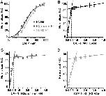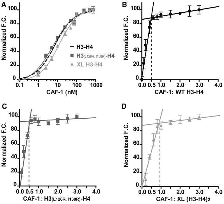 Figure 4. CAF-1 binds (H3-H4)2 tetramers and H3-H4 dimers with similar affinities, yet 2-fold different stoichiometries. (A) An overlay of the binding curves for CAF-1 titrated into a H3(L126R, I130R)-H4 double mutant that effectively prevents tetramer formation (gray squares) and a cross-linked (H3-H4)2 tetramer (triangle) with the wild-type H3-H4 curve from Figure 1 (dashed line). The curves are very similar to wild-type and produce dissociation constants of 5.5 nM for the double mutant and 9.0 nM for the cross-linked complex (Table 1). (B) Determination of the stoichiometry of the CAF-1•WT H3-H4 complex by titration of CAF-1 into a constant concentration of labeled H3-H4. Fluorescence change occurs until wild-type H3-H4 is saturated with CAF-1 and the ratio at this inflection point is equal to the number of CAF-1 molecules bound to a single H3-H4 complex. (C) Determination of the stoichiometry of CAF-1/H3(L126R, I130R)-H4 complex. The fluorescence change plateaus similar to that of wild-type (H3-H4)2 tetramer and corresponds to 0.5 CAF-1 molecules per 1 H3(L126R, I130R)-H4 dimer or a 1:2 stoichiometry. (D) The cross-linked (H3-H4)2 tetramer is bound by a single CAF-1 molecule, as shown by the near 1:1 ratio obtained by the titration.The error bars represent the standard error within individual data points.The total data points for a single experiment are 48.