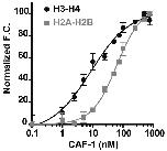Figure 1. CAF-1 binds H3-H4 with ∼20-fold higher affinity than H2A-H2B. Titration of CAF-1 into fluorescently labeled histone complexes (H3-H4 and H2A-H2B) results in a change in fluorescent signal, indicating direct binding events. The normalized fluorescent change was plotted against increasing CAF-1 concentration (log [CAF-1]) to produce a binding curve where the CAF-1 concentration at 50% fluorescent change equals the apparent dissociation constant (Kdapp) for the CAF-1/histone complex. CAF-1 binds H3-H4 in the low nanomolar range with the averaged data points shown as black circles. The data points were fit with a non-linear regression curve to establish the apparent dissociation constant and Hill coefficient. CAF-1 binds H2A-H2B with significantly lower affinity, which is seen by a rightward shifted binding curve (gray squares). The error bars represent the standard error within individual data points. The total data points for a single experiment are 48.