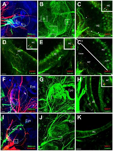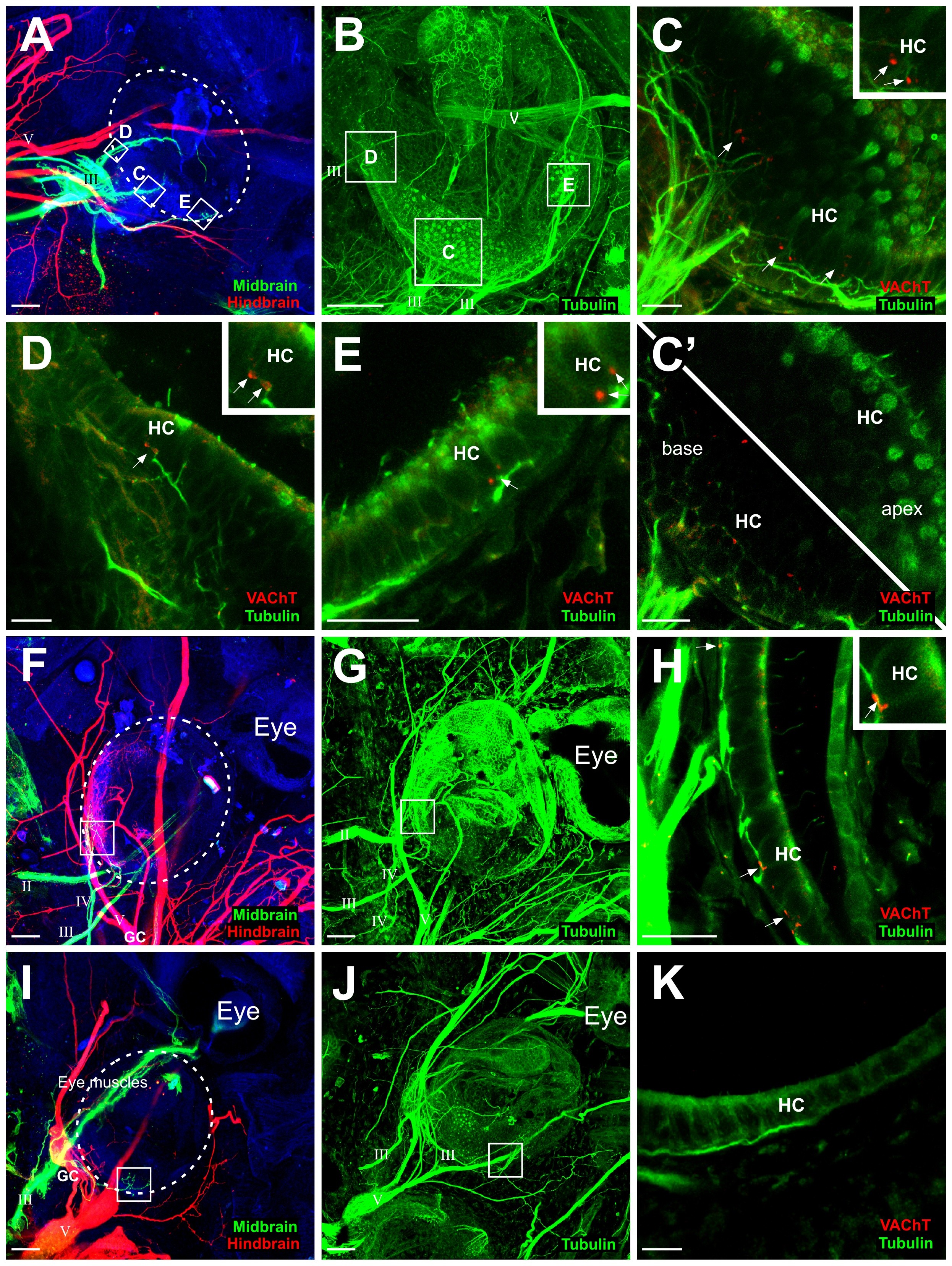 (A) Implantations of lipophilic dyes into the midbrain (green) and hindbrain (red) revealed axon projections from the oculomotor nerve (III) to hair cells of the transplanted ear (circled). (B) Immunohistochemistry for tubulin of the ear in A shows all innervation. (C) Immunohistochemistry for VAChT (red) confirms motor terminals on hair cells (HC) of boxed areas in B. Insets show higher magnification of VAChT staining at the base of hair cells. (C′) Single z-series images at the base of the hair cells (lower left) showing VAChT-positive terminals and at the apex (upper right) devoid of VAChT staining. (F) Implantations of lipophilic dyes into the midbrain (green) and hindbrain (red) revealed axon projections from the trochlear nerve (IV) to hair cells in the transplanted ear (circled). Afferent axons projected along the trigeminal nerve to the hindbrain, demonstrated by the colocalization of ganglion cells (GC) with the red lipophilic dye. (G) Immunohistochemistry for tubulin of the ear in G shows all innervation. (H) Immunohistochemistry for VAChT (red) confirms motor terminals on hair cells of boxed area in G. Inset shows higher magnification of VACHT staining at the base of hair cells. (I) Implantations of lipophilic dyes into the midbrain (green) and hindbrain (red) revealed ganglion cells (GC) projecting along the oculomotor nerve (III). For this ear, the oculomotor nerve innervated the eye muscles ventral to the transplanted ear. (J) Immunohistochemistry for tubulin of the ear in I shows all innervation. (K) Immunohistochemistry for VAChT (red) shows the absence of motor terminals on hair cells (HC) of boxed area in I. Scale bar is 100 in A, B, F, G, I, J; 25 in C, C′, D, E,H, K.