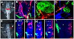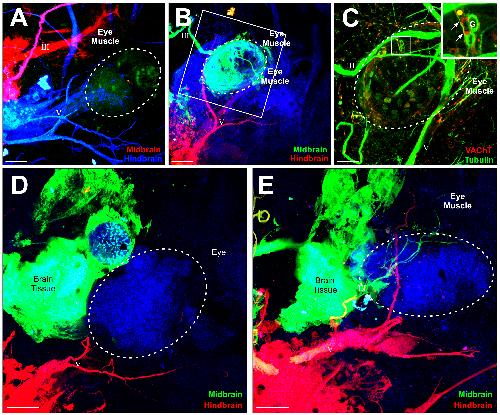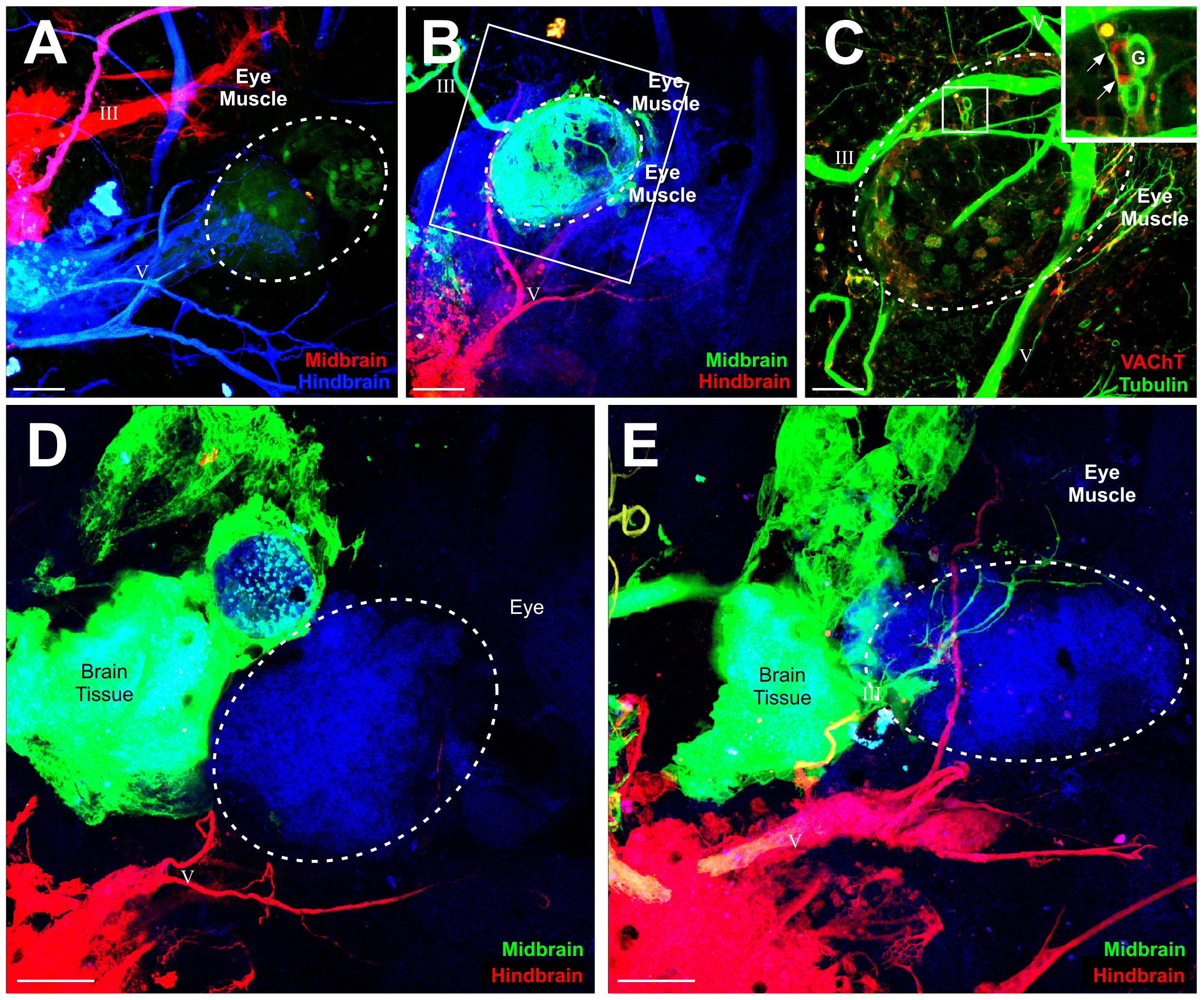 (A) Implantations of dye into the midbrain (red) and hindbrain (blue) revealed axon projections from oculomotor nerve to the eye muscles but not to the transplanted somite-derived muscle (GFP, green). (B) Single z series showing innervation to the eye muscle but not the transplanted somite-derived muscle (GFP, green). (D) Implantations of dye into the hindbrain at the level of the trigeminal (red) and the glossopharyngeal, vagus, and hypoglossal (green) revealed axons projecting to transplanted somite-derived muscle tissue, likely from the hypoglossal nerve. (E) Implantations of dye ventral to the spinal cord revealed spinal motor neuron innervation of surrounding somite-derived muscle but not to the GFP-positive eye muscle (green) transplanted with the eye. (F) Implantations of dye ventral to the spinal cord revealed spinal motor neuron innervation of surrounding somite-derived muscle, but not to the jaw muscle transplanted from a dextran-injected embryo. Scale bar is 100 .